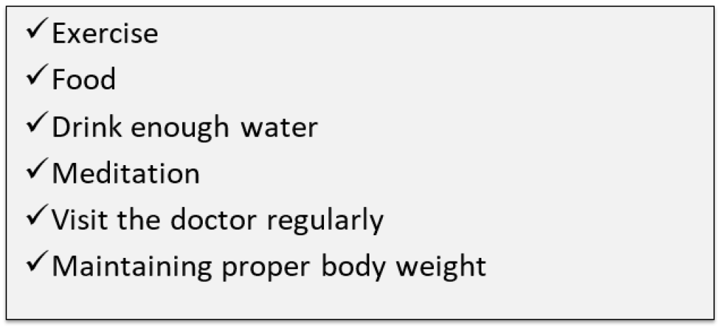 Regular Exercise: Listed exercises should be done, like walking, dancing, cycling etc. At least 30 minutes or more should be devoted to weekly exercise.